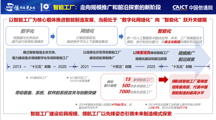 报告认为,智能工厂作为智能制造发展的核心载体,当前处在“数字化网络化”向“智能化”跃升的关键期,正迈向规模推广和前沿探索的新阶段。领航级智能工厂作为梯度培育体系的最高级,是过去十年我国智能工厂建设成果的集中体现,代表了当前全球智能制造的最高水平,是创新范式、生产方式和管理模式变革探索的标杆典范。
