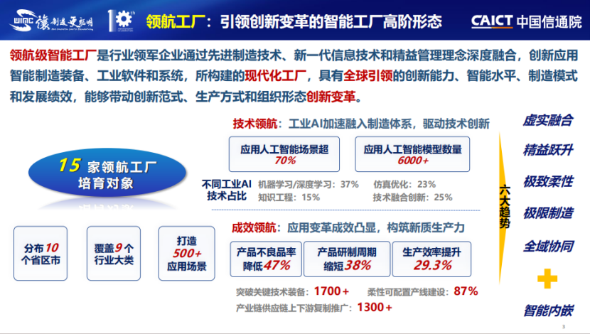 报告分析,15家领航级智能工厂培育对象应用人工智能场景超70%,应用人工智能模型数量6000余个,突破应用关键技术装备超1700个,总体呈现六大核心发展趋势: